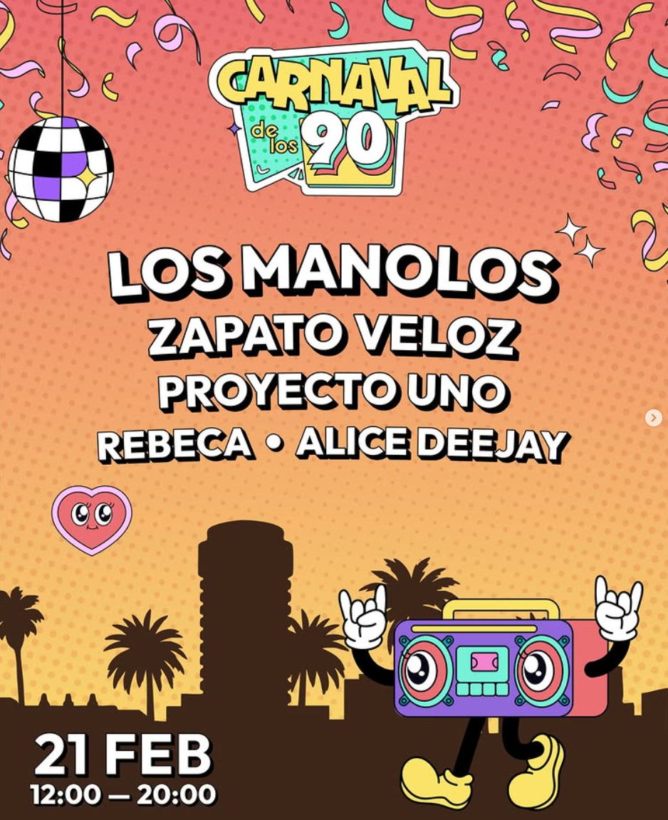 Este año vuelvo a repetir en el Carnaval de los 90s, un evento pensado para recordar toda aquella época a los que la vivimos tan intensamente y que en esta edición contará con artistas tan inolvidables como Los Manolos, Zapato Veloz, Proyecto Uno, Rebeca y Alice Deejay.